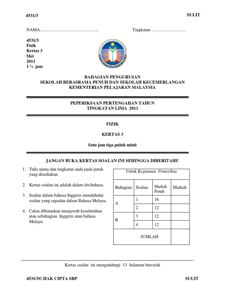Kurikulum Standard Sekolah Menengah KSSM yang dilaksanakan secara berperingkat mulai tahun 2017 menggantikan Kurikulum Bersepadu Sekolah Menengah KBSM yang telah dilaksanakan sejak tahun 1989 bagi memenuhi hasrat yang terkandung dalam Pelan. Koleksi Soalan Percubaan Fizik SPM 2018 Soalan Percubaan Fizik SPM 2018 MRSM -Kertas 1 Kertas 2 Kertas 3 Jawapan 1 Jawapan 2 Jawapan 3 J.